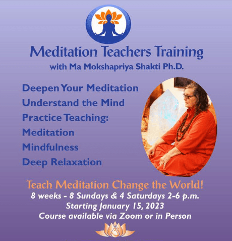 “If you are interested in teaching meditation or deepening your practice, you must take the Yogashakti Meditation Teacher Training with Ma Mokshapriya Shakti. Through this training you will receive inspirational instruction on Mindfulness and Meditation. More importantly, you will begin a personal transformation which will open pathways to peace, love, and joy in your life.”Continue reading “Teach Meditation, Change the World”