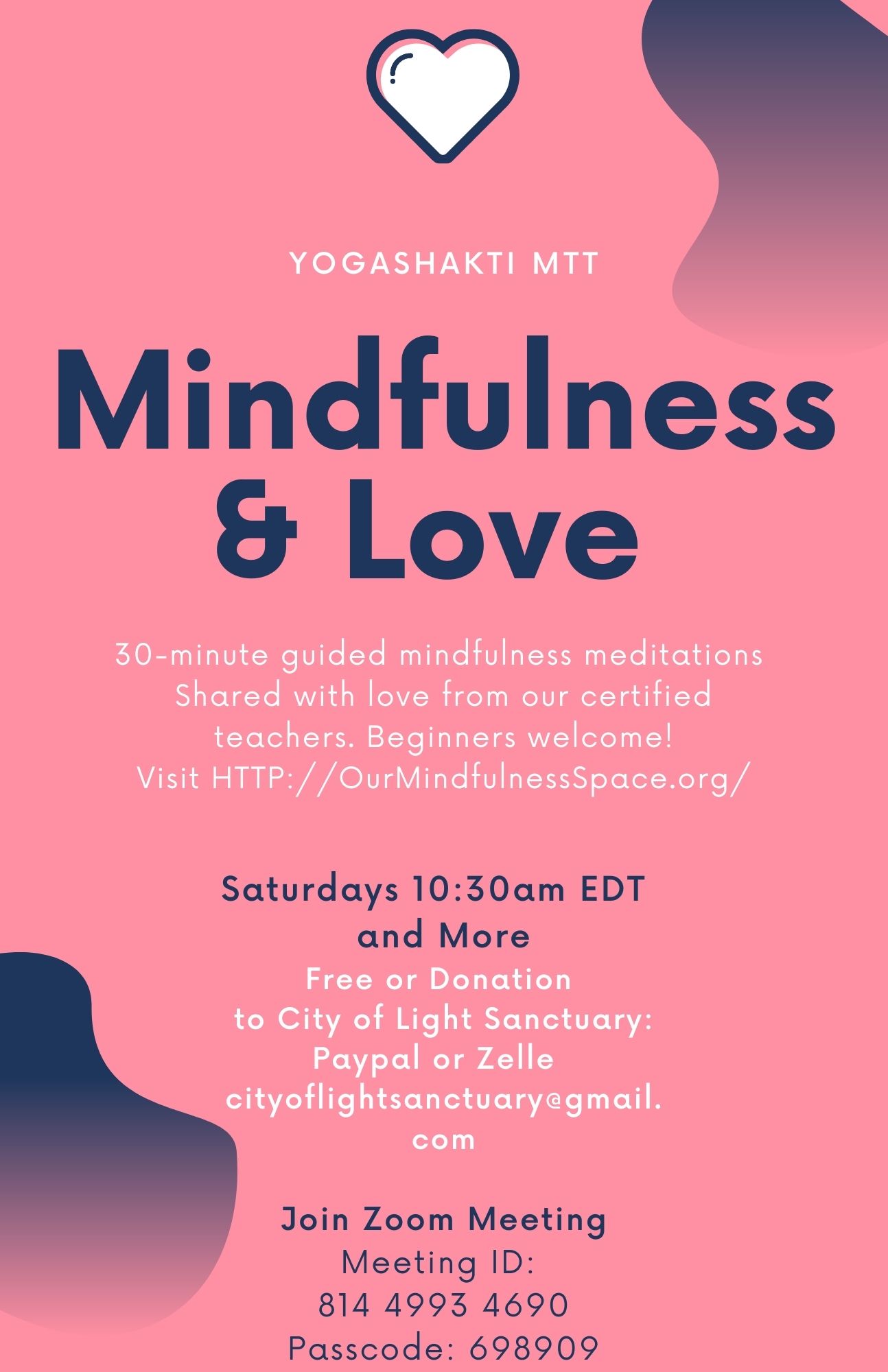 We are offering our weekly 30-minute guided mindfulness meditations again in September. Starting Thursday, 9/2, 8:30pm; Saturday, 9/11, 10:30am, and more. See full schedule here, https://ourmindfulnessspace.org/schedules/ Each session, attendees have the opportunity to practice mindfulness with a teacher, to quiet the mind. When our minds are quiet, we can feel more relaxed.